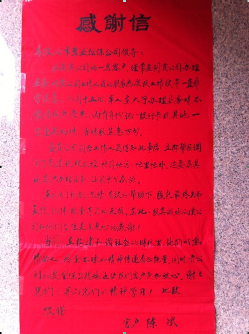 工作人員的熱情細致的服務(wù)態(tài)度,給陳斌先生及家人留下深刻印象。事后,為了表達感激之情,陳先生送來親筆抒寫的感謝信,寫道:“在構(gòu)建和諧社會的時代里,他們以熱情助人,拾金不昧的精神傳遞著正能量!同時,安慶市房屋置業(yè)擔(dān)保公司的安全保衛(wèi)措施也使我們客戶更加放心!”